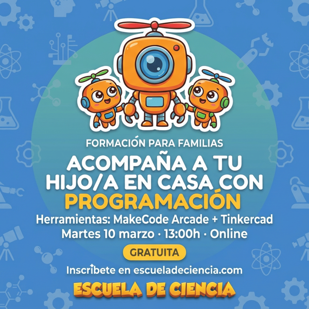 Por eso vamos a hacer una sesión online, gratuita, para madres y padres (seáis de Escuela de Ciencia o no), donde os enseñaremos dos herramientas que usamos en clase y que vuestros hijos pueden seguir usando fuera.